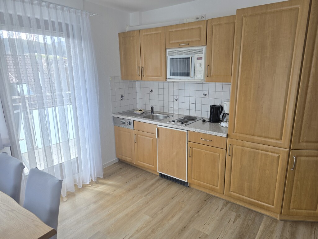 Wohnzimmer mit integrierter Küchenzeile mit Spülmaschine, Minibackofen, Mikrowelle